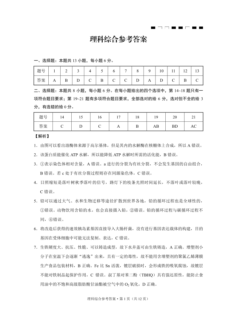 云南师范大学附属中学2024届高考适应性月考卷(十)理科综合答案