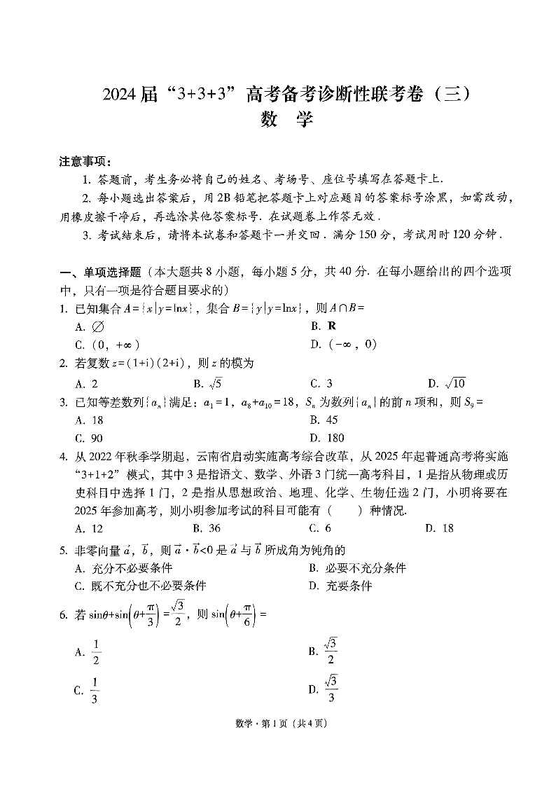 云南省3+3+3高三2024届下学期高考备考诊断性联考(三)数学