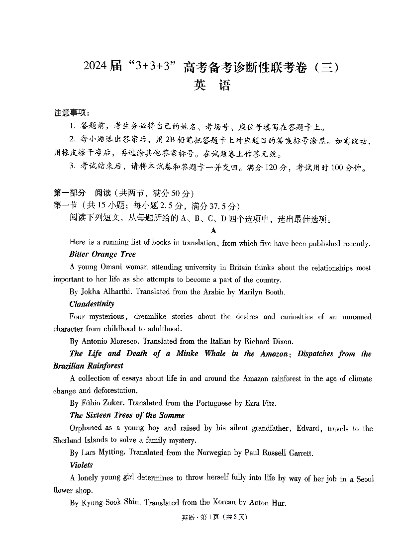 云南省3+3+3高三2024届下学期高考备考诊断性联考(三)英语