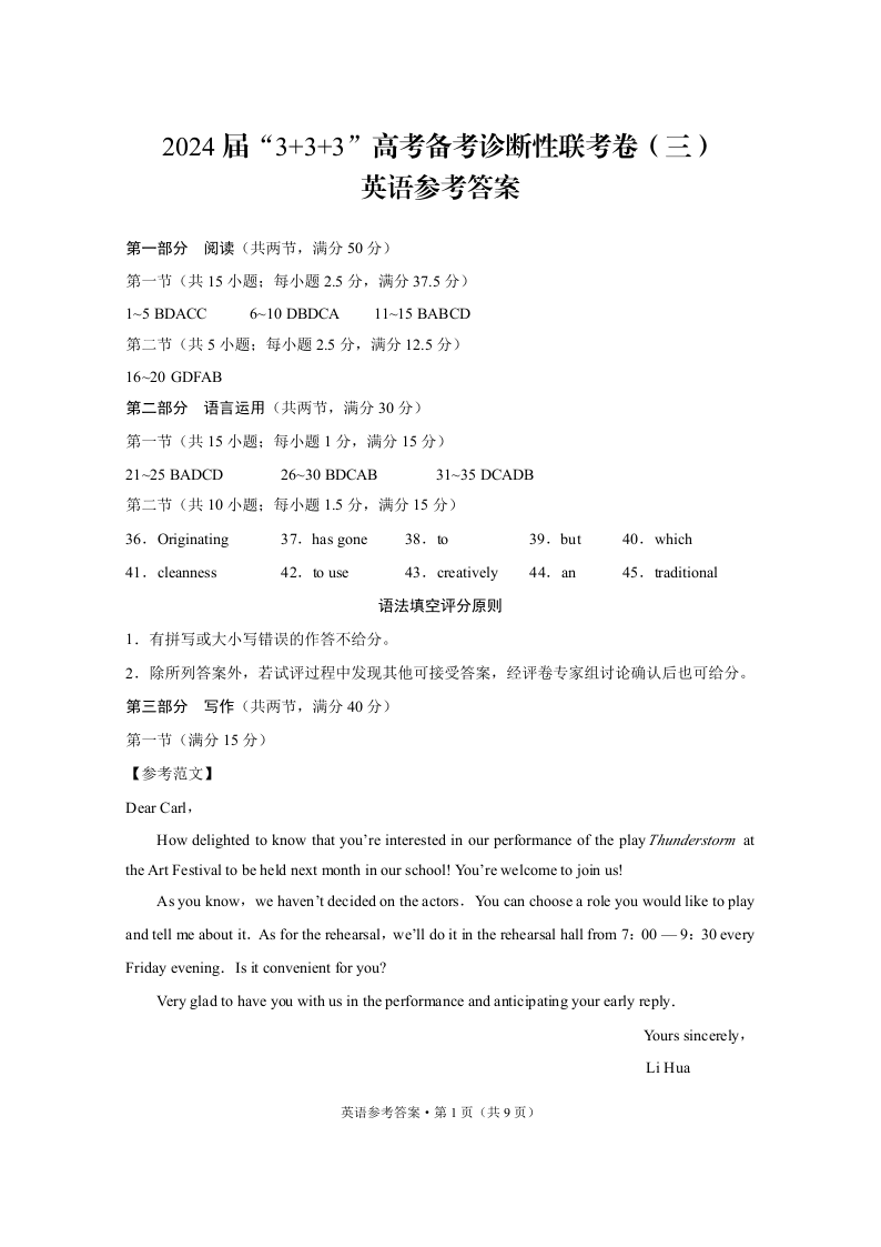 云南省3+3+3高三2024届下学期高考备考诊断性联考(三)英语答案