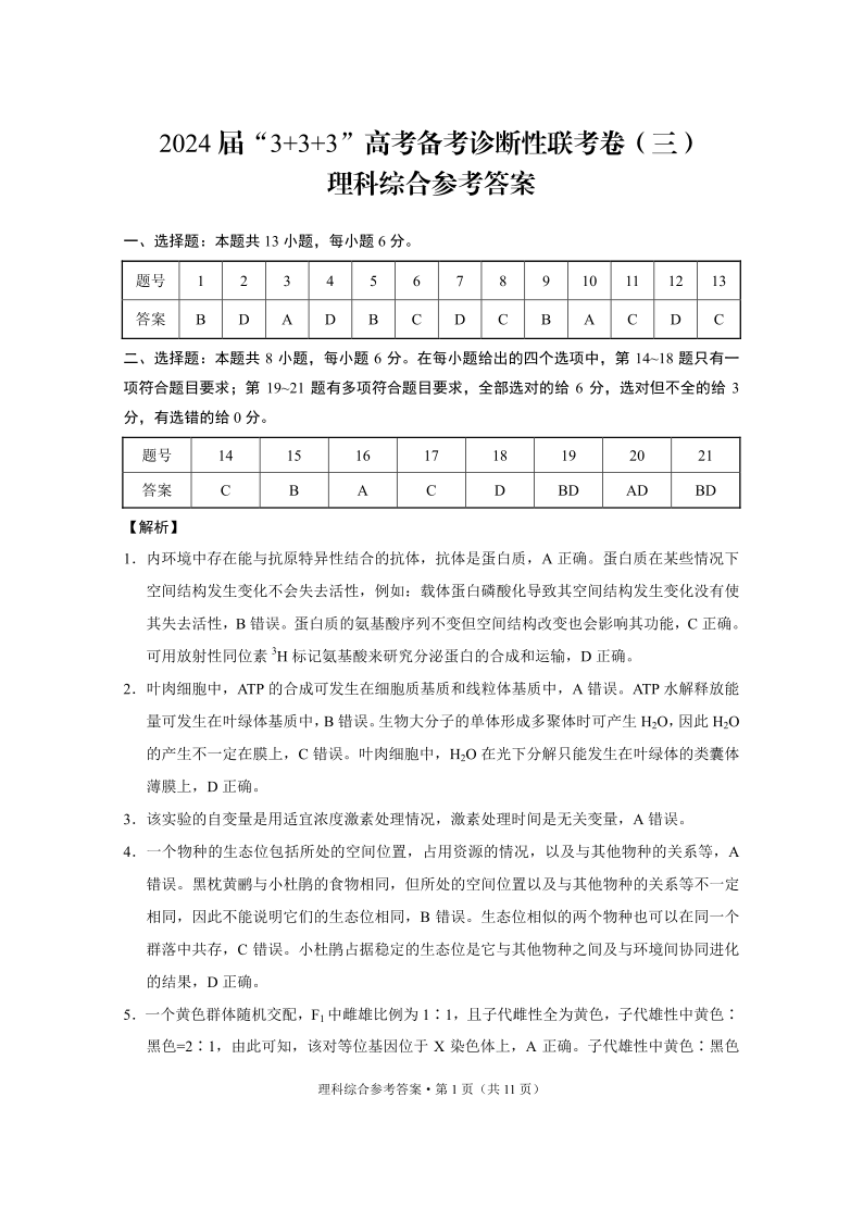 云南省3+3+3高三2024届下学期高考备考诊断性联考(三)理综答案