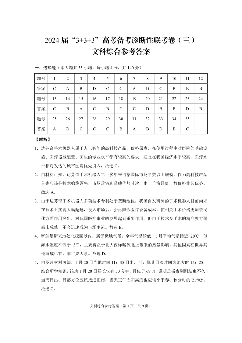云南省3+3+3高三2024届下学期高考备考诊断性联考(三)文综答案