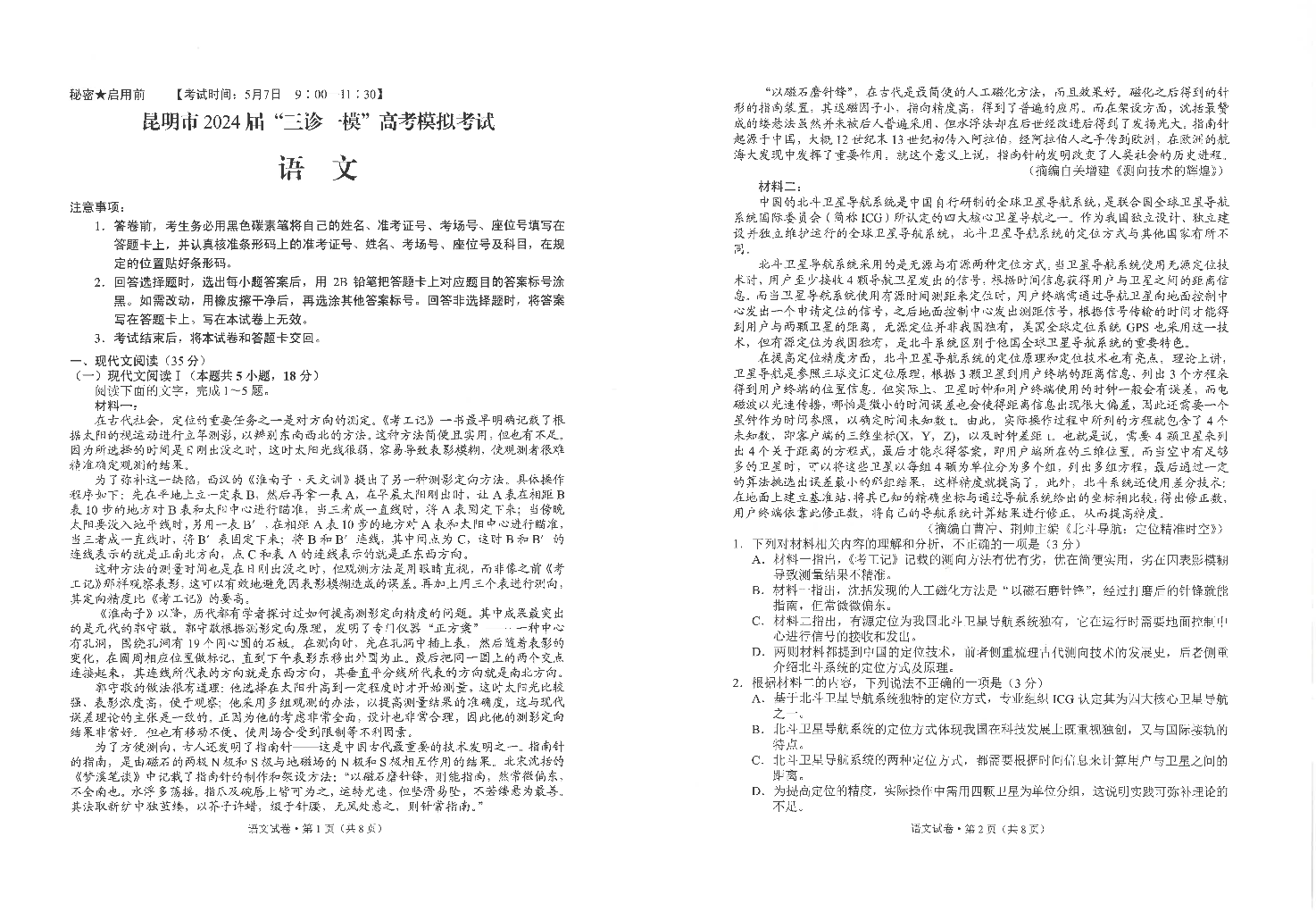 云南省昆明市2024届三诊一模高考模拟考试(昆明三模)语文