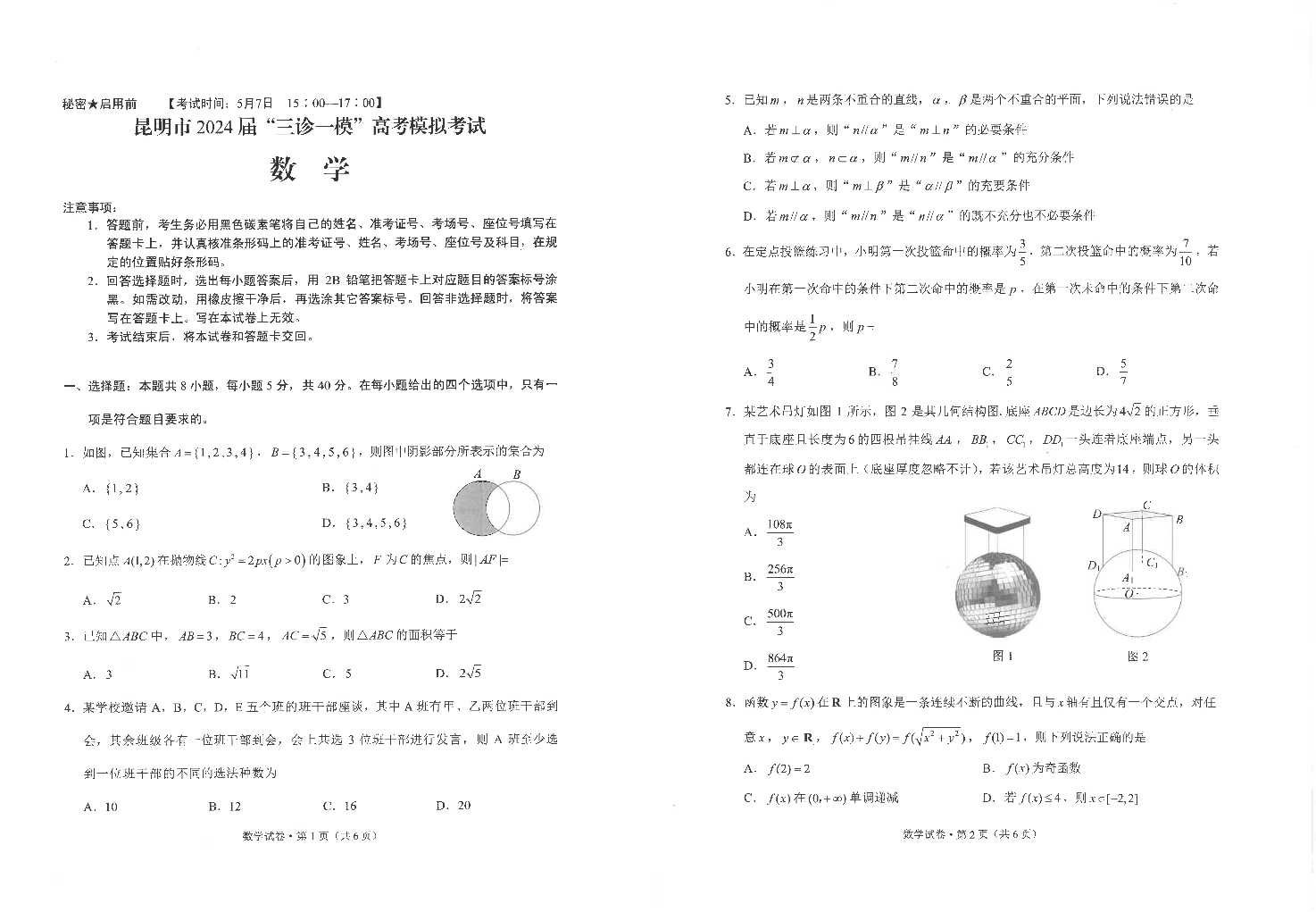 云南省昆明市2024届三诊一模高考模拟考试(昆明三模)数学