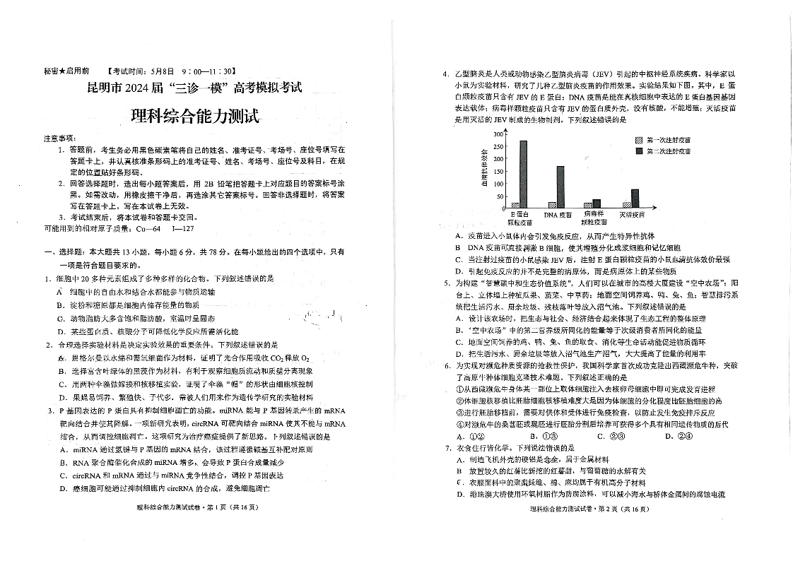 云南省昆明市2024届三诊一模高考模拟考试(昆明三模)理综