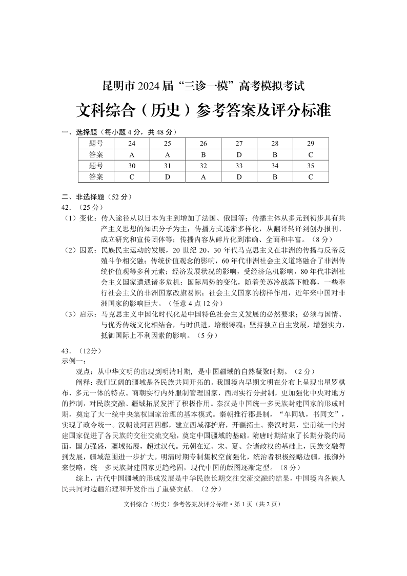云南省昆明市2024届三诊一模高考模拟考试(昆明三模)历史答案