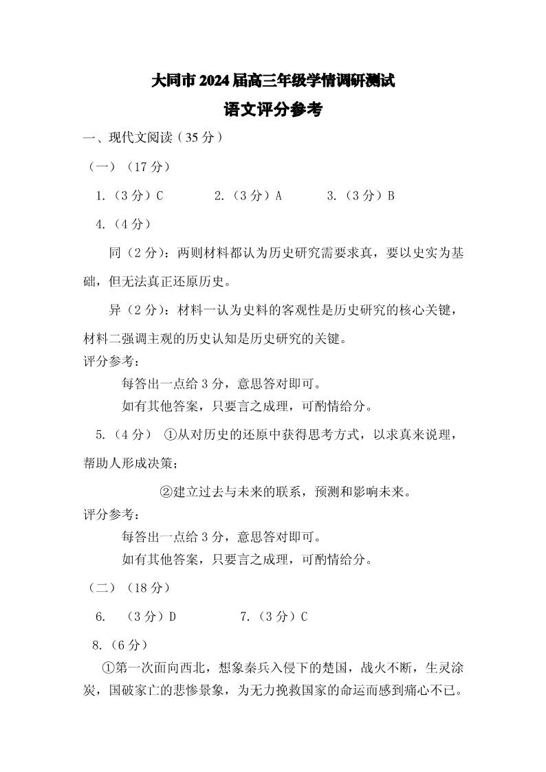 山西省大同市2024届高三年级学情调研测试语文答案