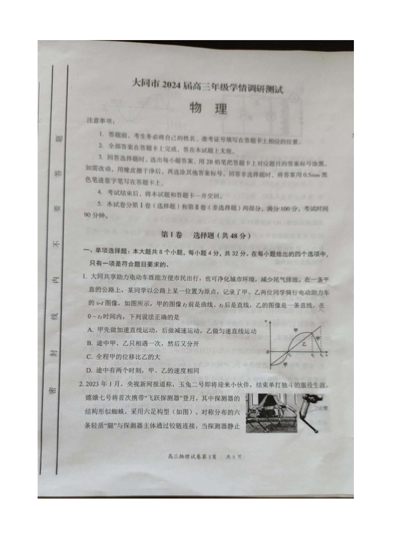 山西省大同市2024届高三年级学情调研测试物理