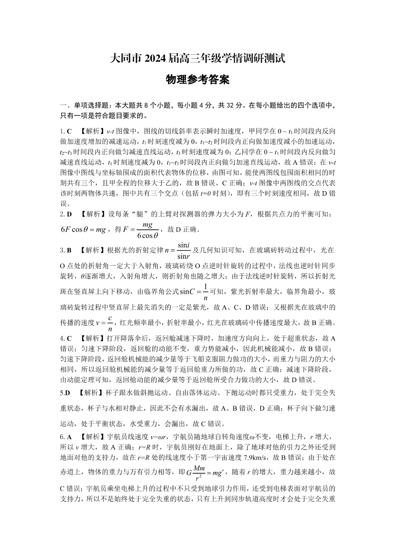 山西省大同市2024届高三年级学情调研测试物理答案