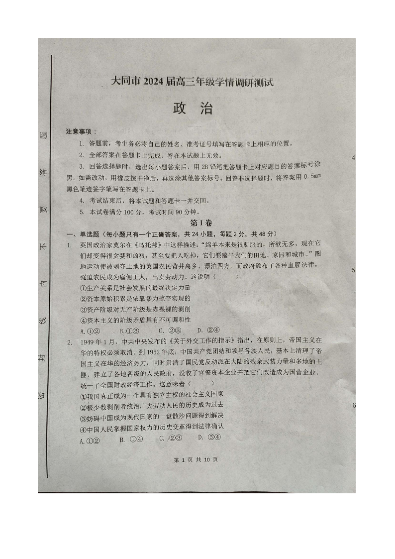 山西省大同市2024届高三年级学情调研测试政治