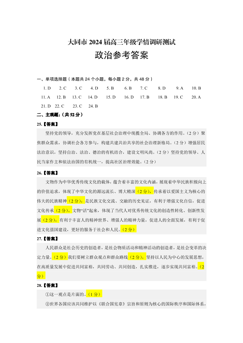 山西省大同市2024届高三年级学情调研测试政治答案