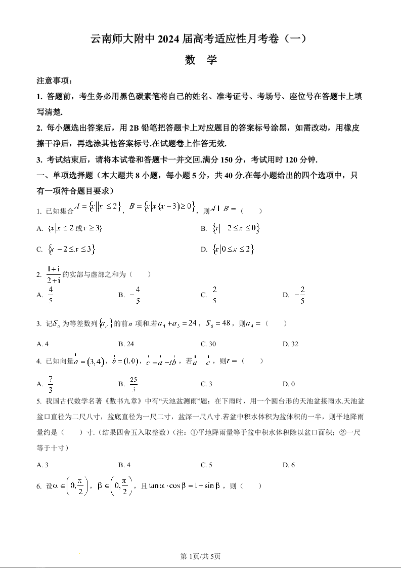 云南省昆明市云南师大附中2024届高考适应性月考卷(一)数学(原卷版)