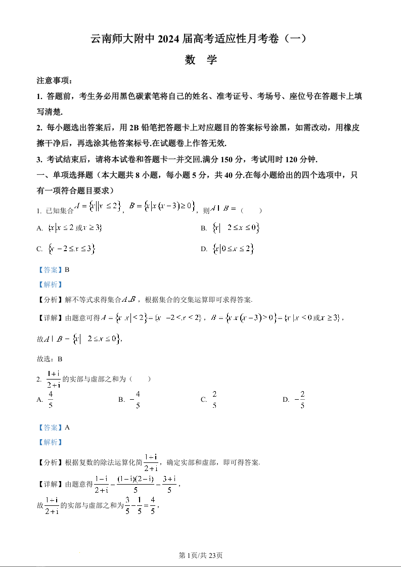 云南省昆明市云南师大附中2024届高考适应性月考卷(一)数学(精品解析版)