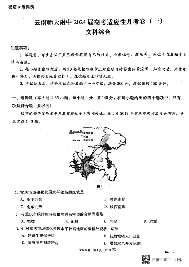 云南省昆明市云南师大附中2024届高考适应性月考卷(一)文综
