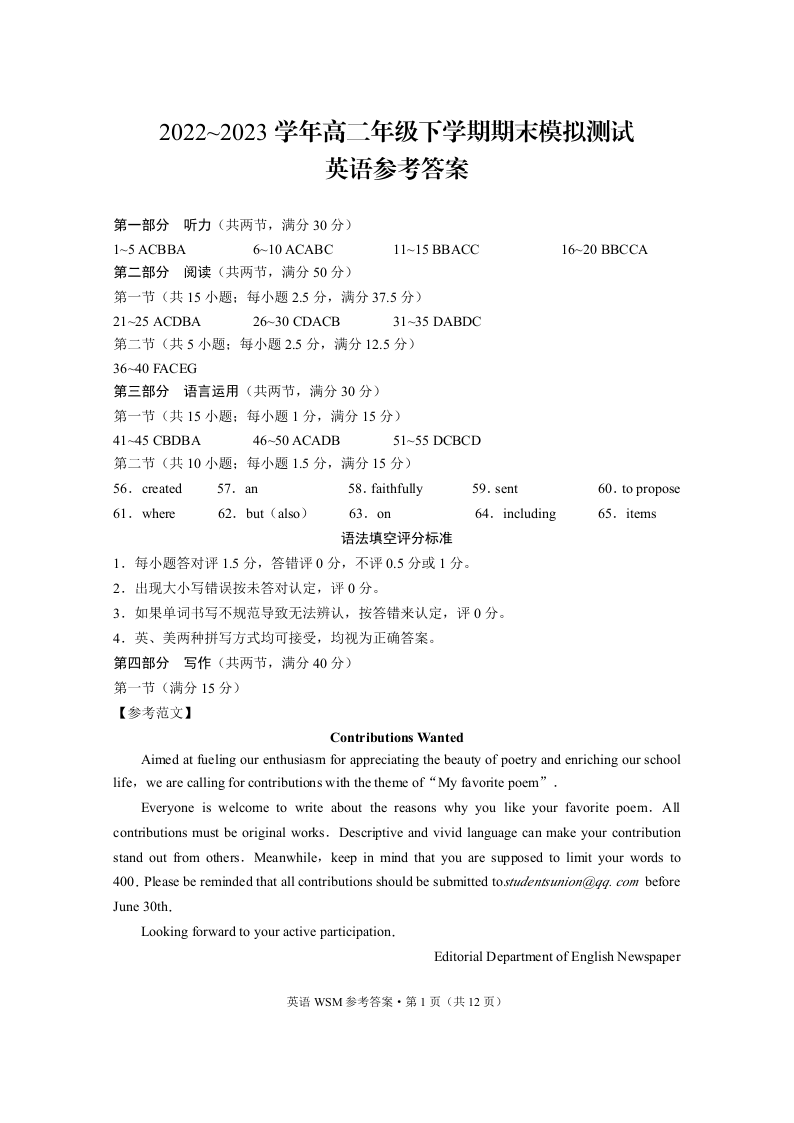 云南省保山市2024届年级下学期期末模拟英语答案