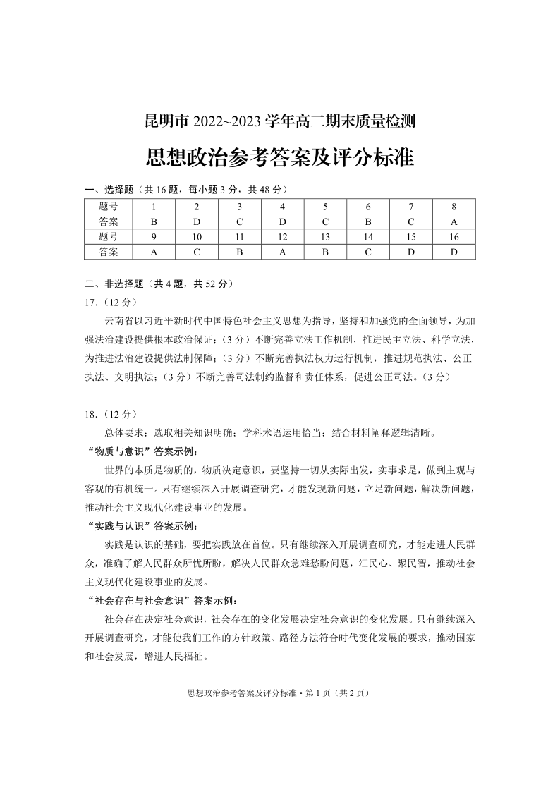 云南省昆明市2024届下学期期末考试政治答案