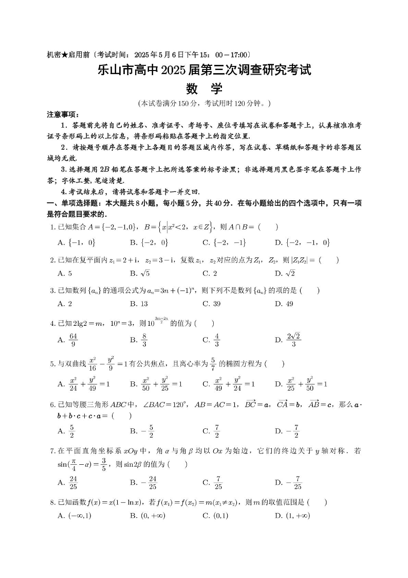四川省乐山市2025届高三下学期第三次调查研究考试数学+答案