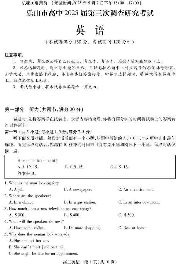 四川省乐山市2025届高三下学期第三次调查研究考试英语+答案