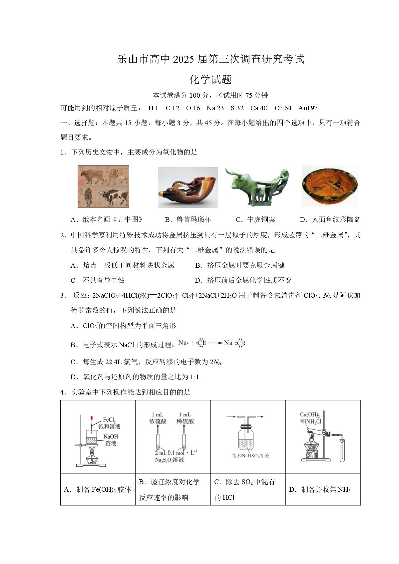 四川省乐山市2025届高三下学期第三次调查研究考试化学