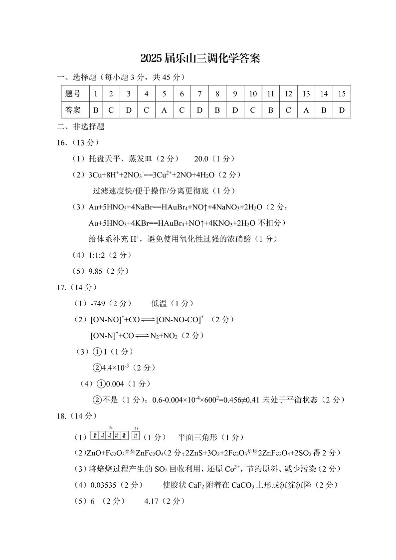 四川省乐山市2025届高三下学期第三次调查研究考试化学答案