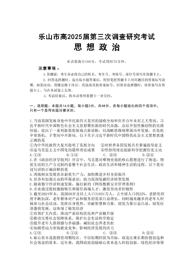 四川省乐山市2025届高三下学期第三次调查研究考试政治