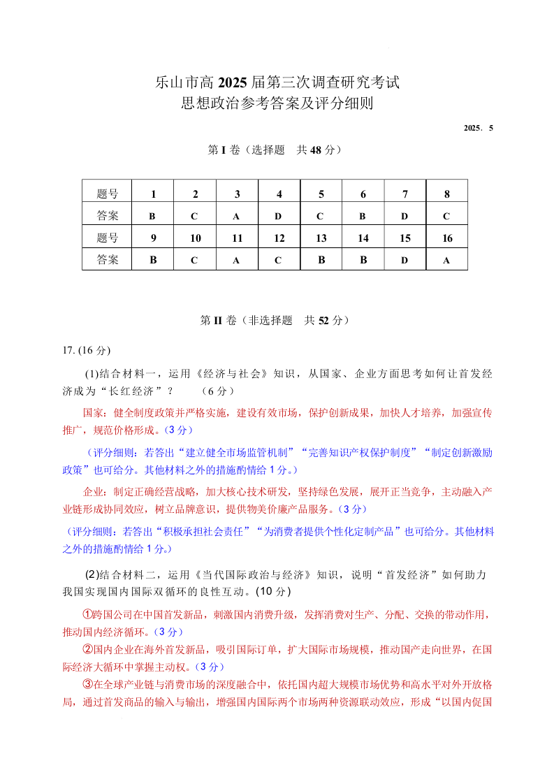 四川省乐山市2025届高三下学期第三次调查研究考试政治答案