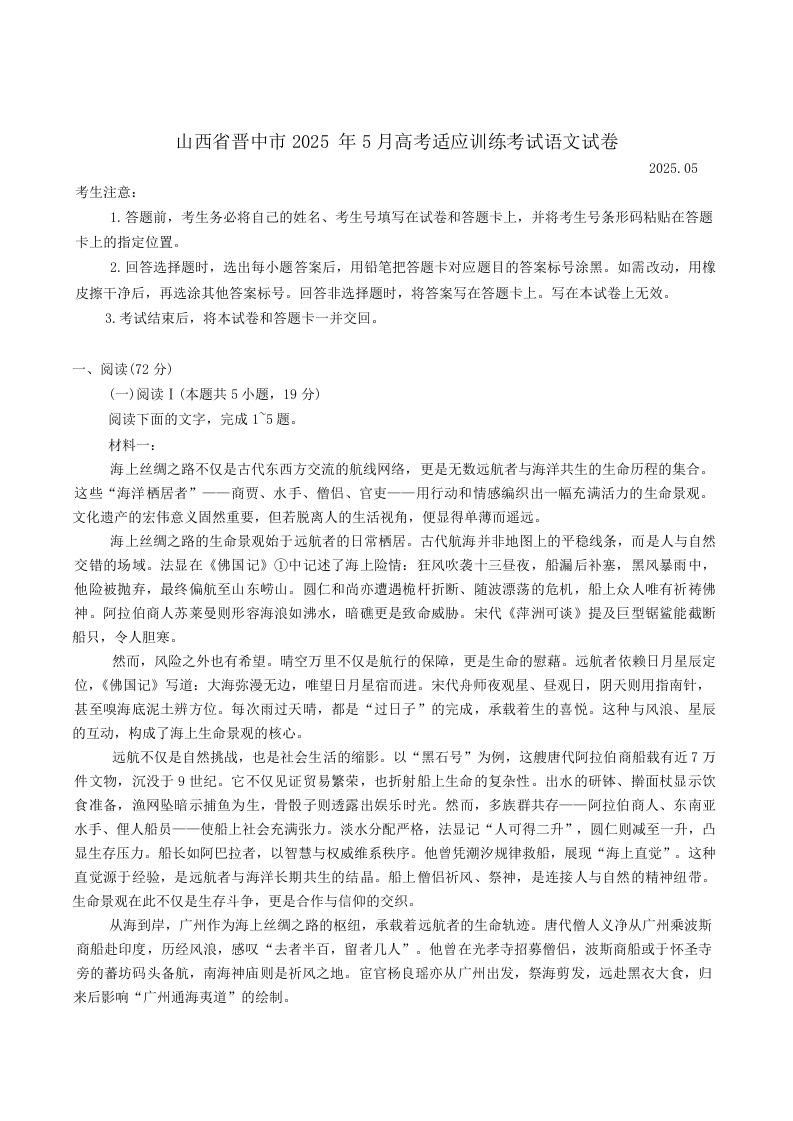 山西省晋中市2025年5月高考适应训练考试(三模)语文+答案