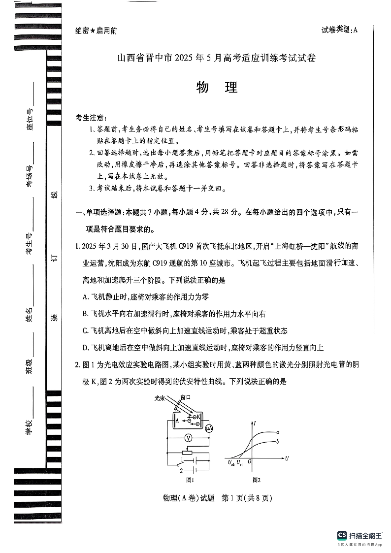 山西省晋中市2025年5月高考适应训练考试(三模)物理