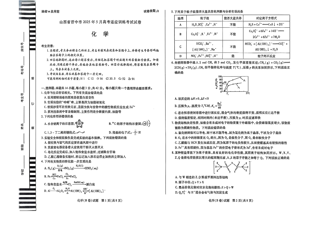 山西省晋中市2025年5月高考适应训练考试(三模)化学