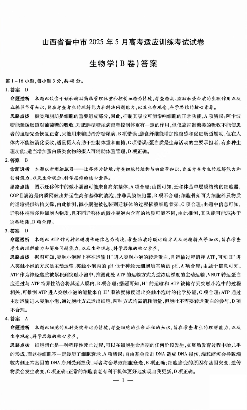 山西省晋中市2025年5月高考适应训练考试(三模)生物答案