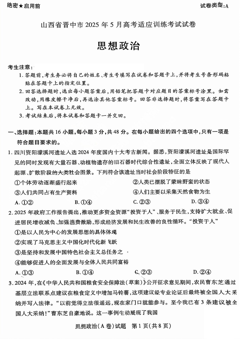 山西省晋中市2025年5月高考适应训练考试(三模)政治