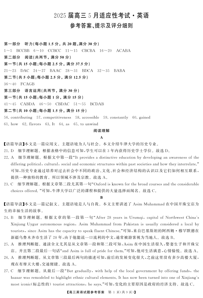 湖南省区域名校2025届高三5月适应性考试英语答案