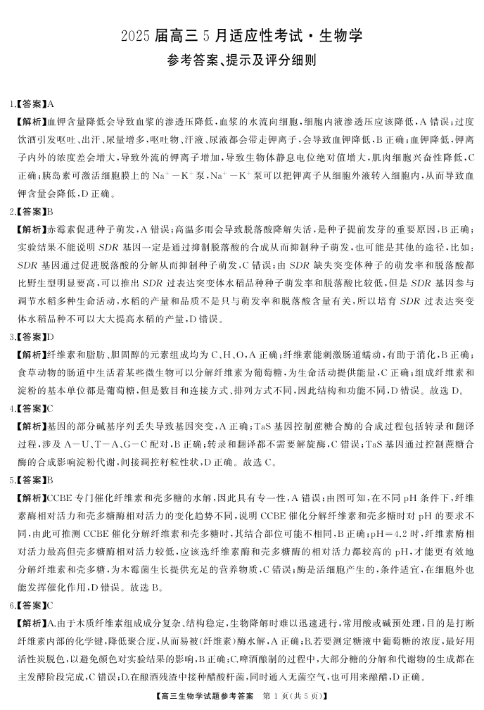 湖南省区域名校2025届高三5月适应性考试生物答案