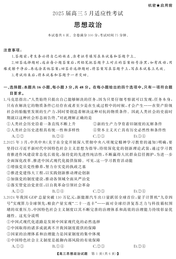 湖南省天壹名校联盟2025届高三5月适应性考试政治