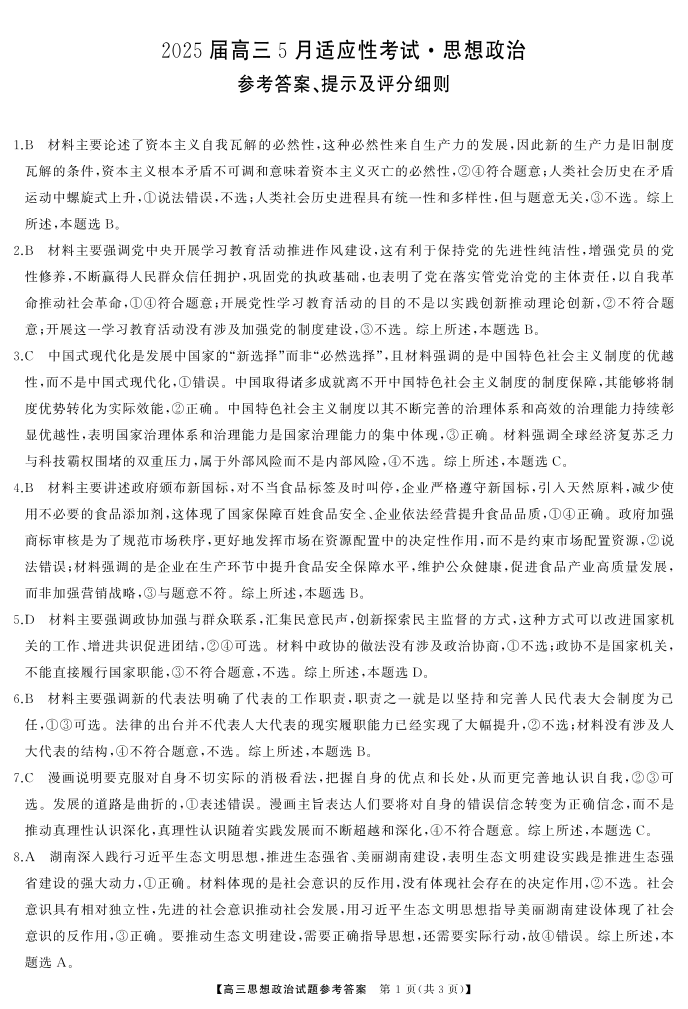 湖南省天壹名校联盟2025届高三5月适应性考试政治答案