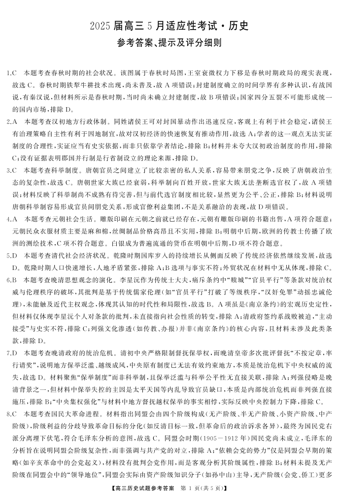 湖南省区域名校2025届高三5月适应性考试历史答案