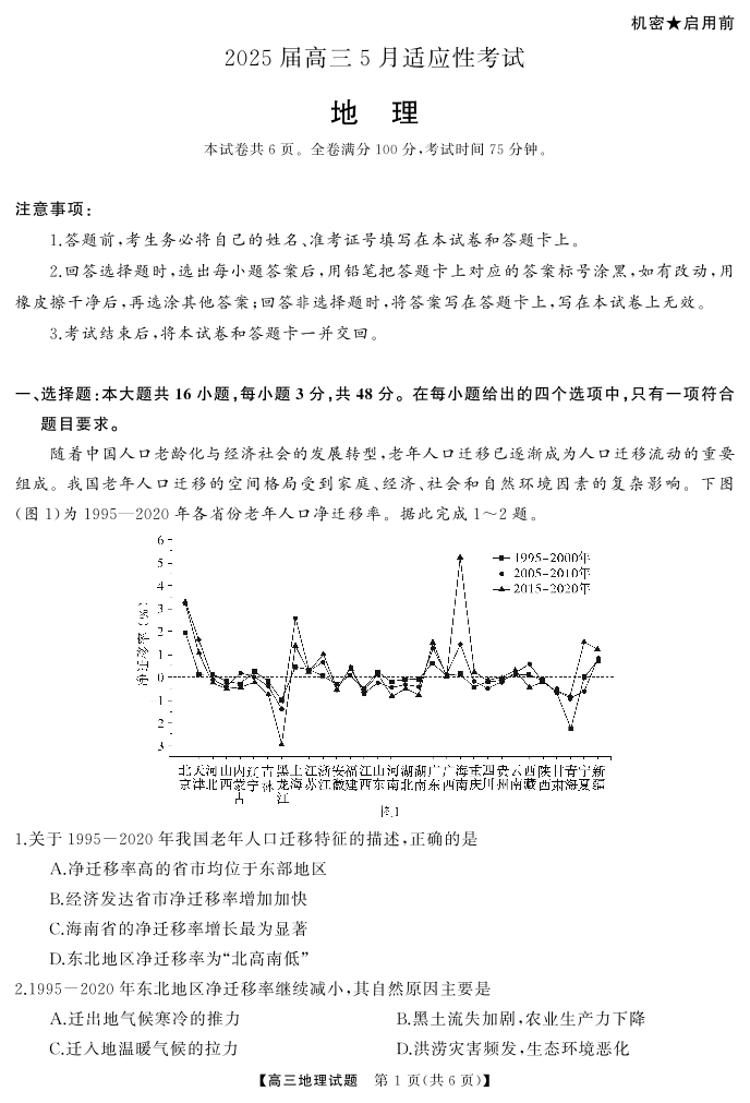湖南省区域名校2025届高三5月适应性考试地理