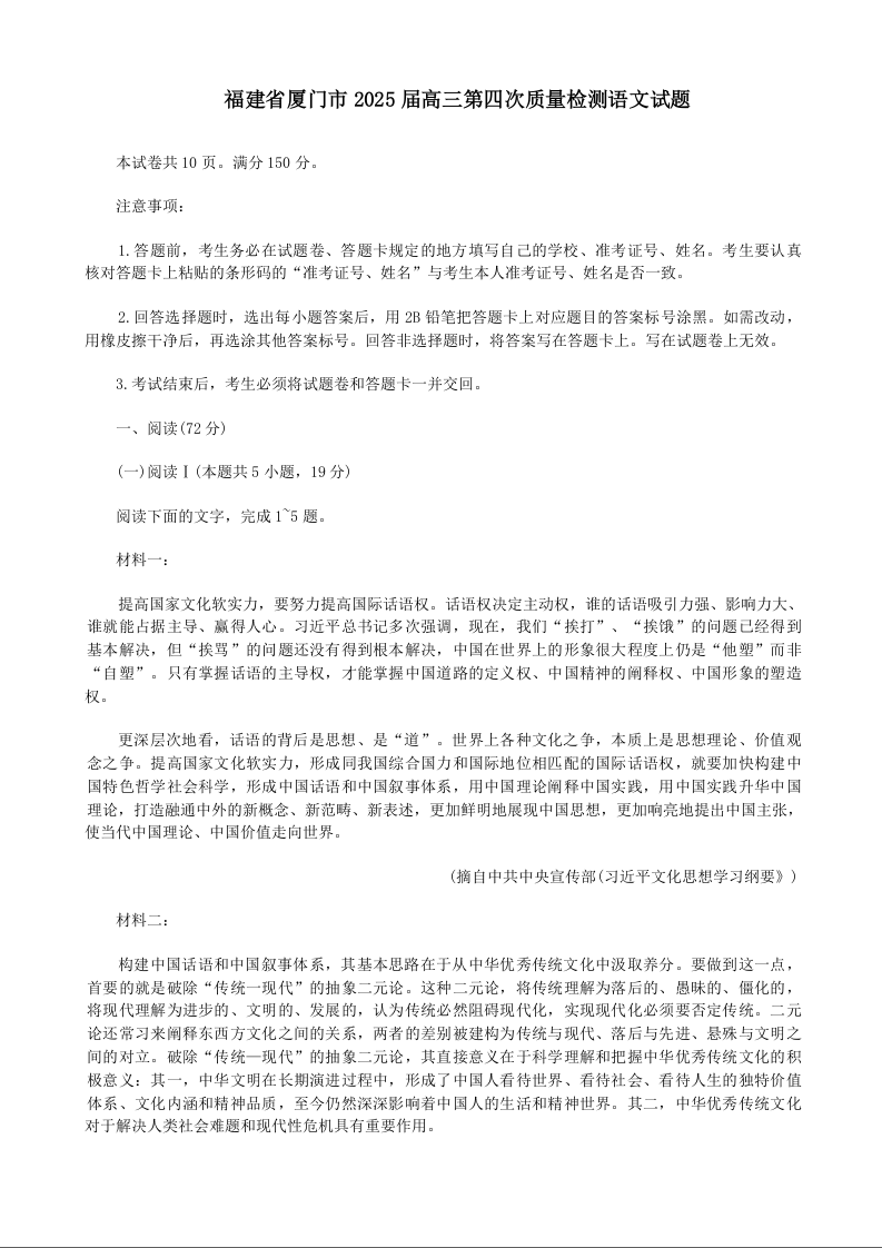 福建省厦门市2025 届高三毕业班第四次质量检测语文+答案