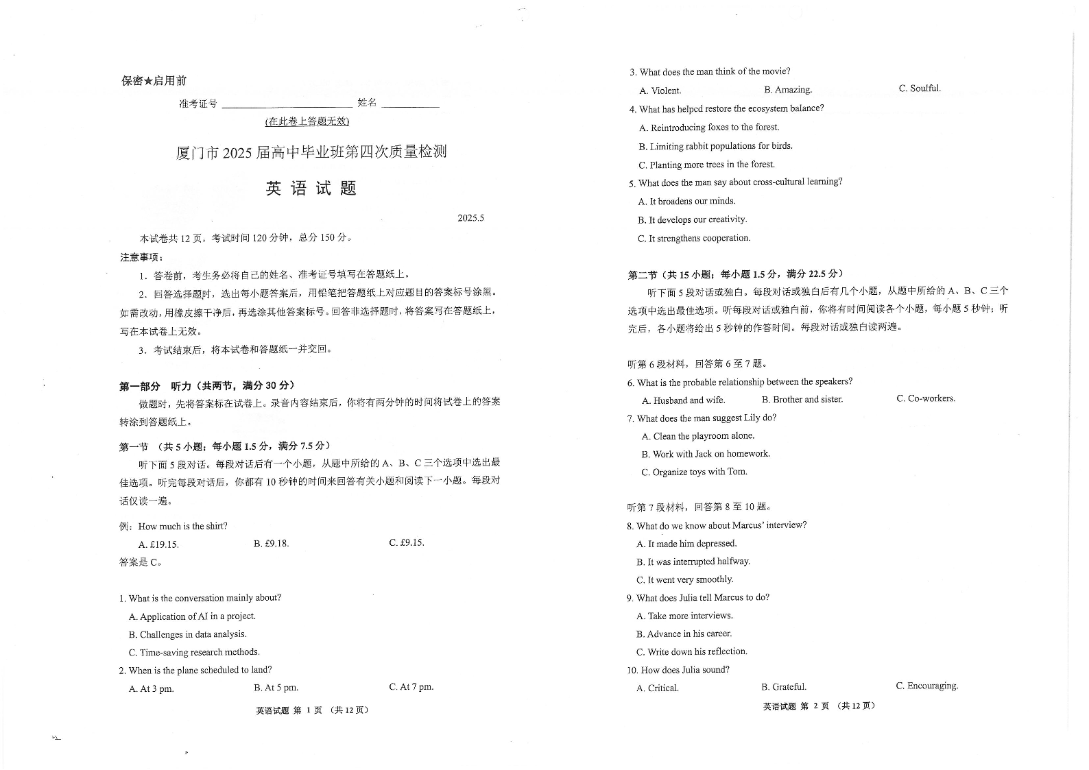 福建省厦门市2025 届高三毕业班第四次质量检测英语+答案