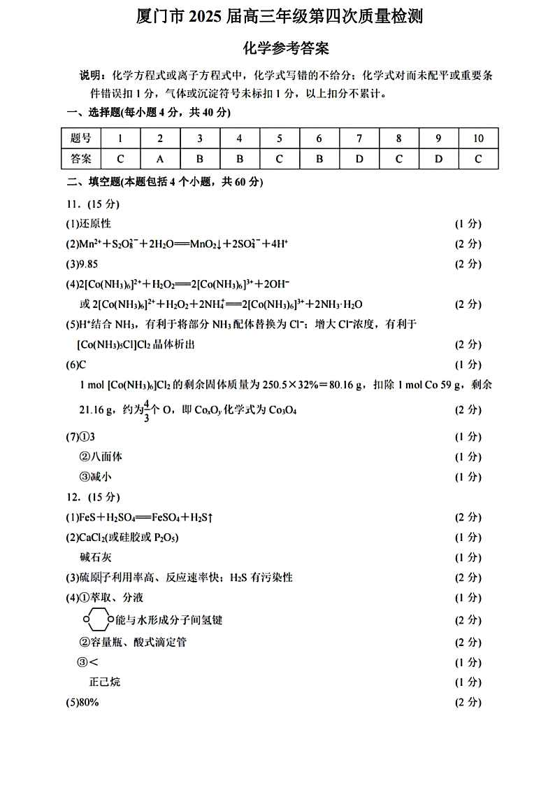 福建省厦门市2025 届高三毕业班第四次质量检测化学答案