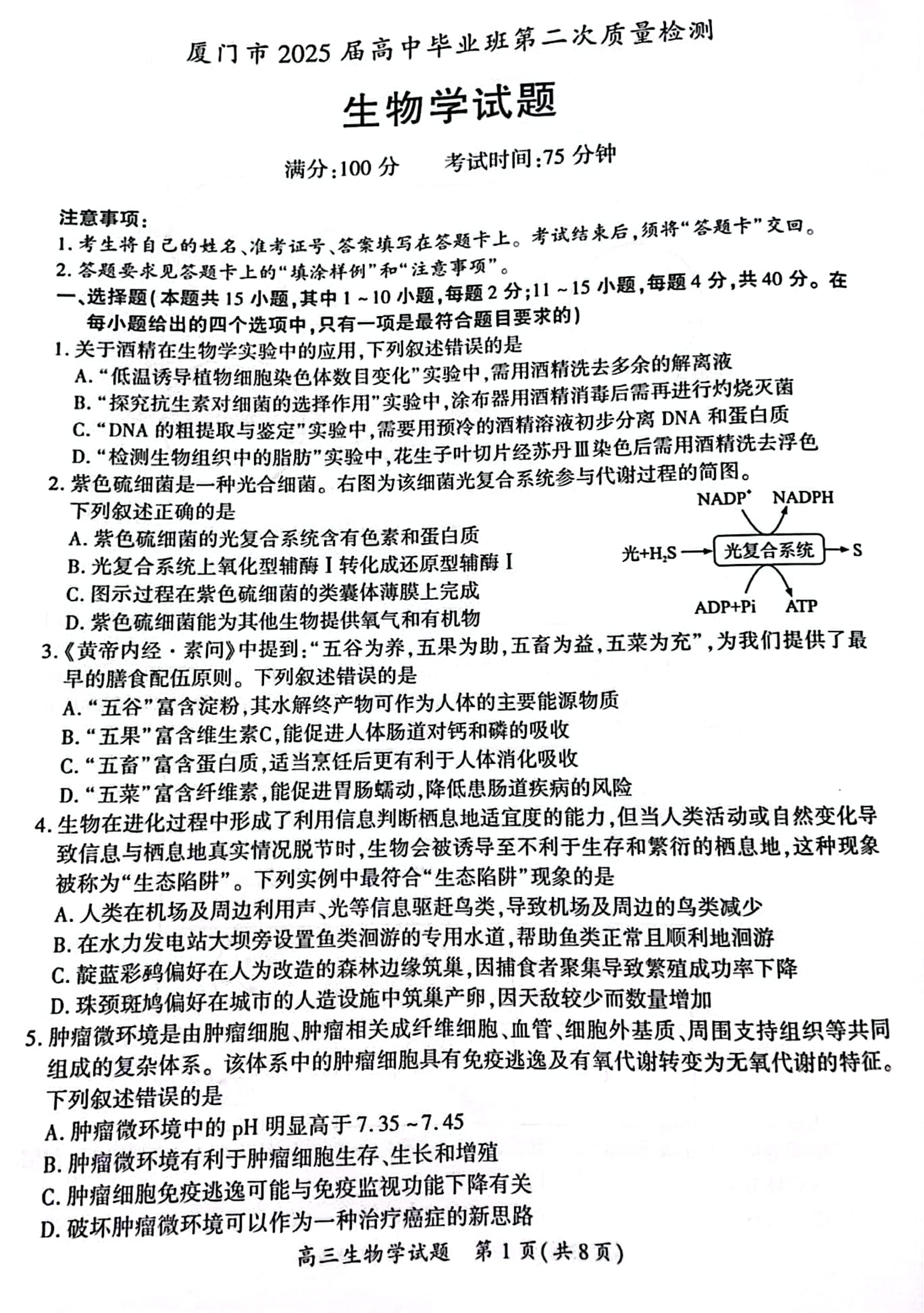 福建省厦门市2025 届高三毕业班第四次质量检测生物