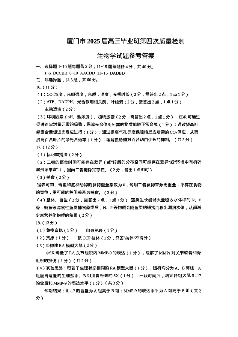 福建省厦门市2025 届高三毕业班第四次质量检测生物答案