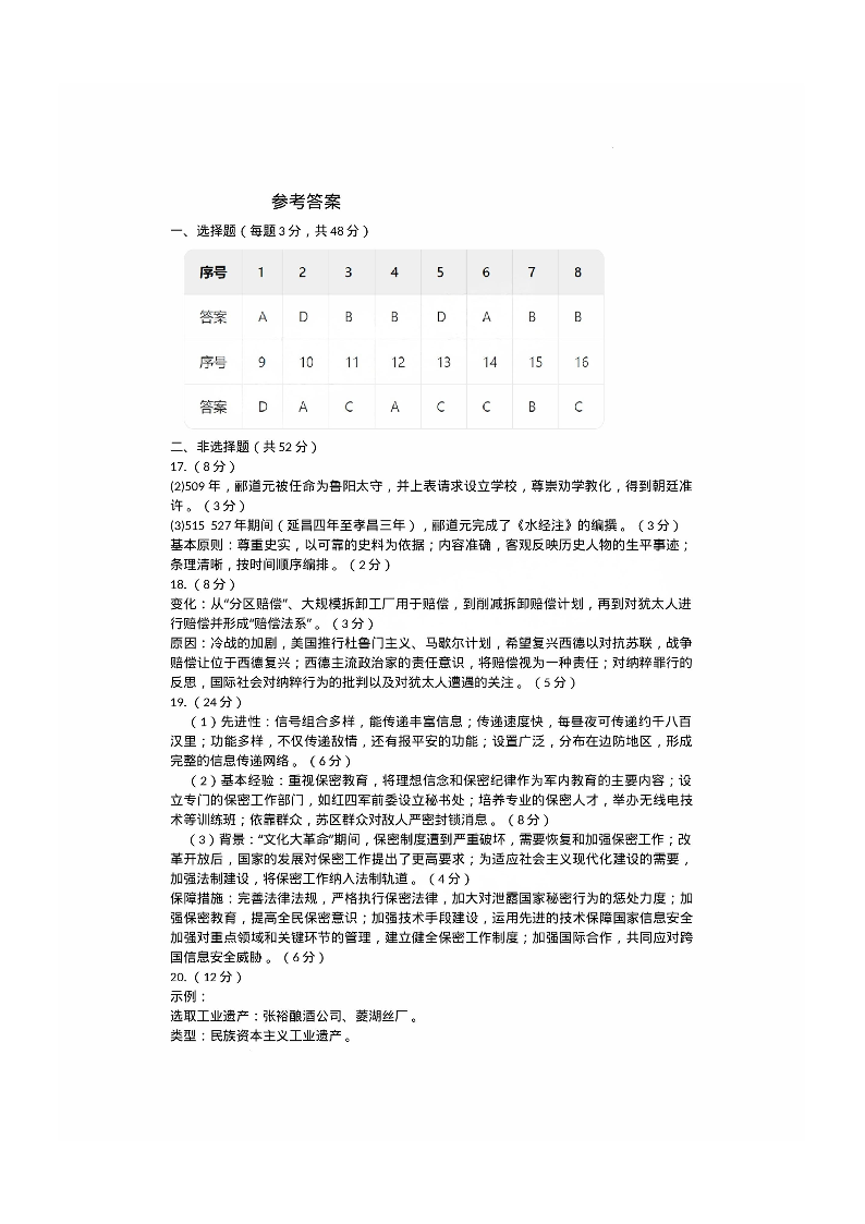 福建省厦门市2025 届高三毕业班第四次质量检测历史答案