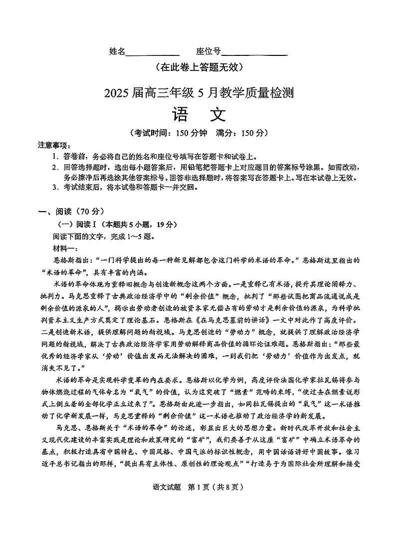 安徽省合肥市示范中学2025届高三5月教学质量检测语文+答案