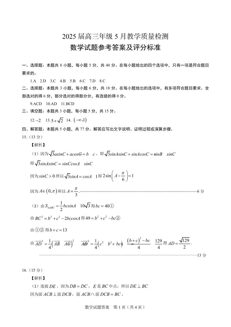 安徽省合肥市示范中学2025届高三5月教学质量检测数学答案