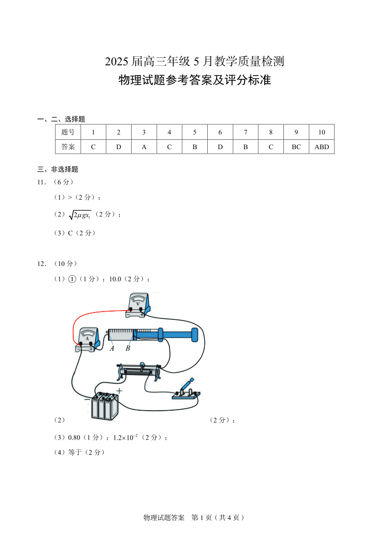 安徽省合肥市示范中学2025届高三5月教学质量检测物理答案