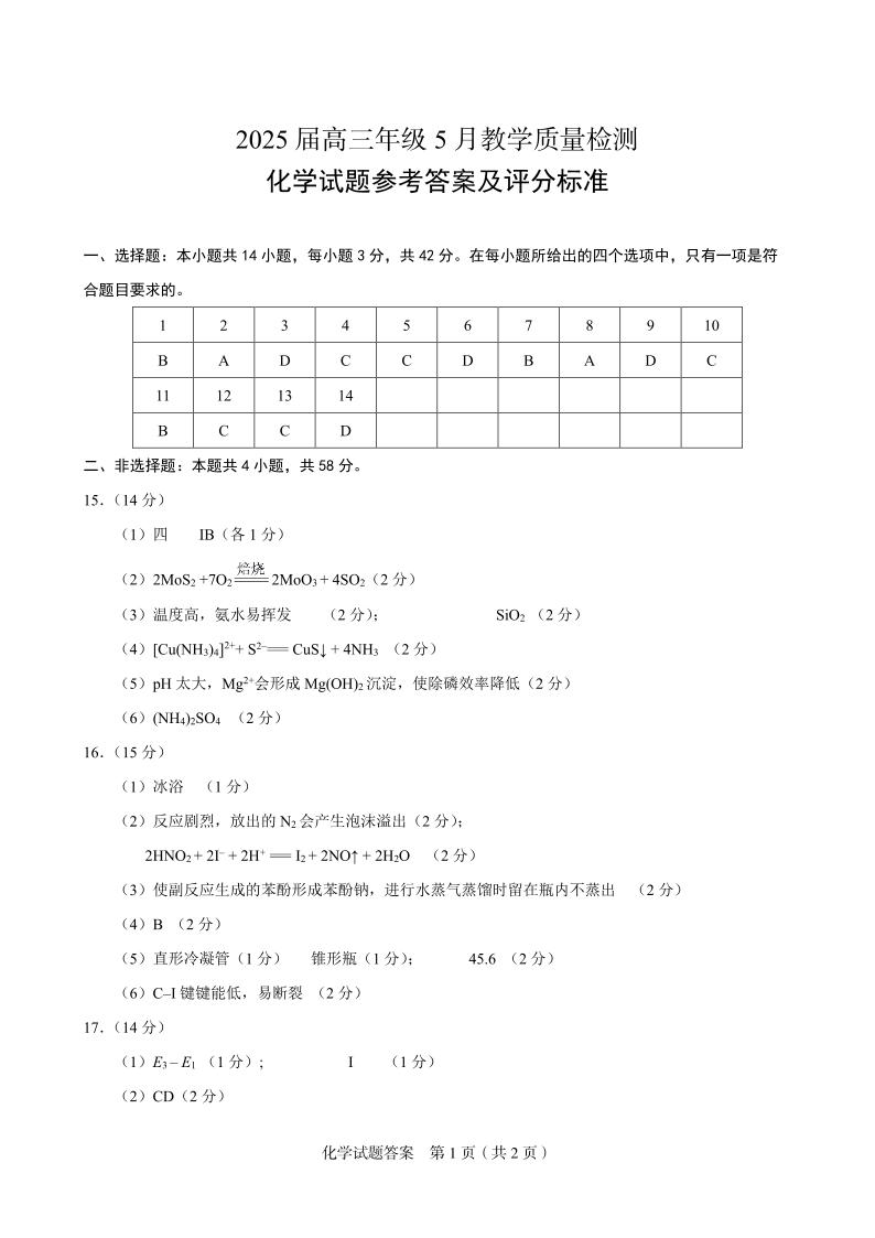 安徽省合肥市示范中学2025届高三5月教学质量检测化学答案