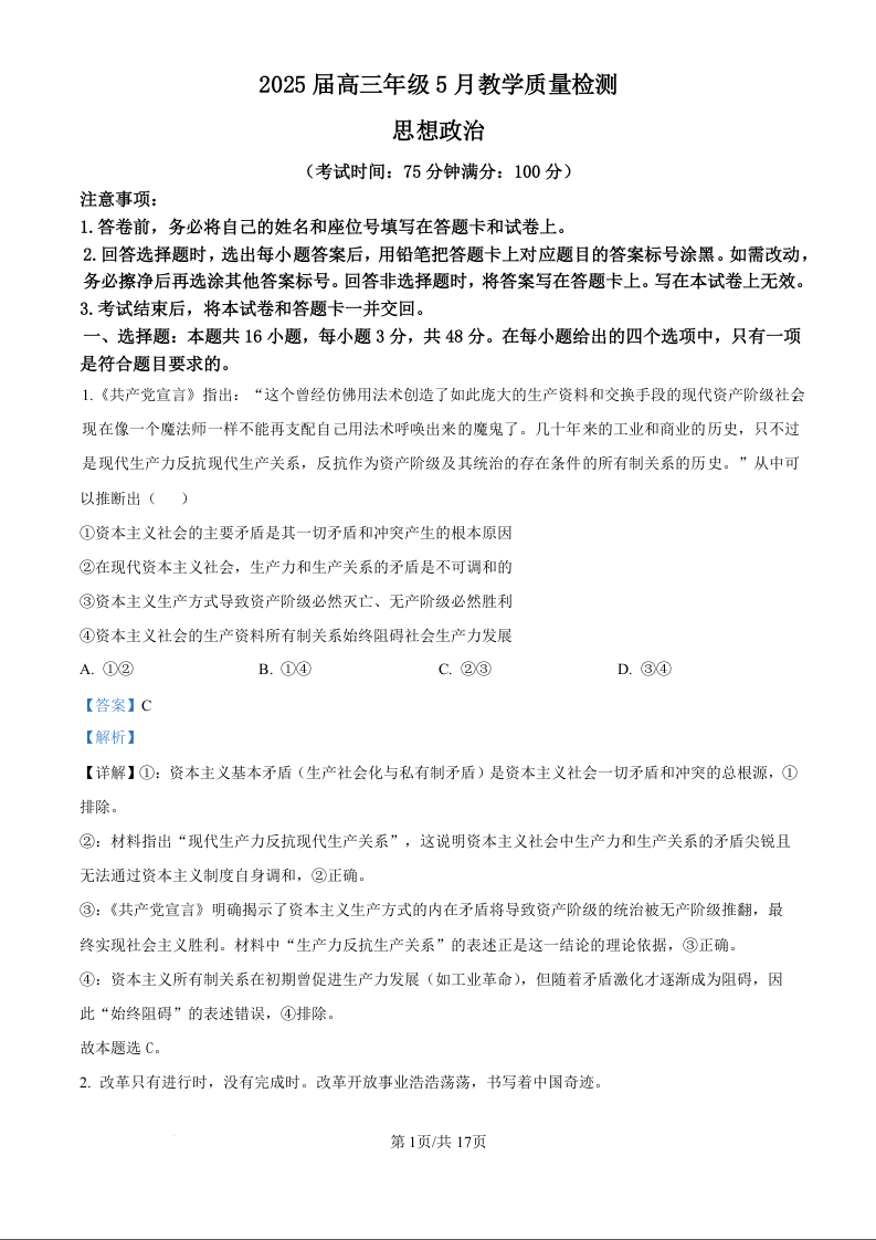 安徽省合肥市示范中学2025届高三5月教学质量检测政治(精品解析版)