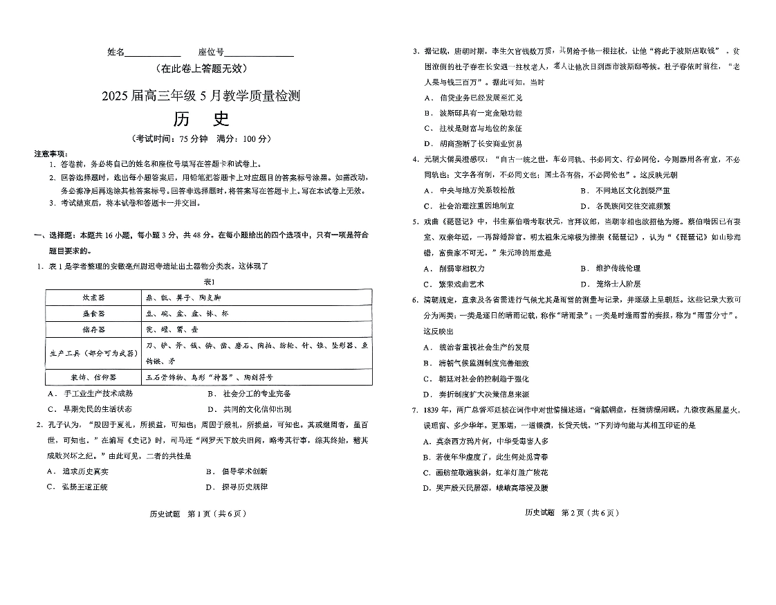安徽省合肥市示范中学2025届高三5月教学质量检测历史