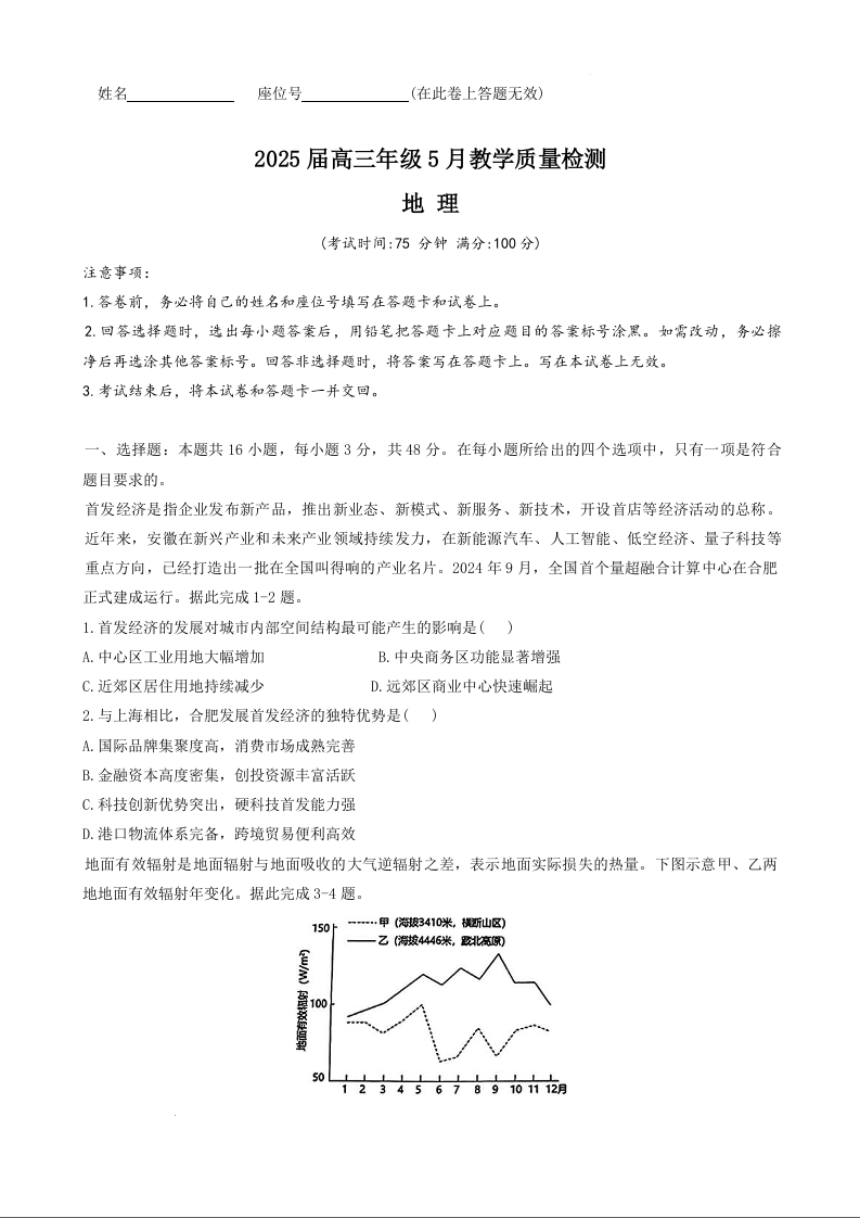安徽省合肥市示范中学2025届高三5月教学质量检测地理